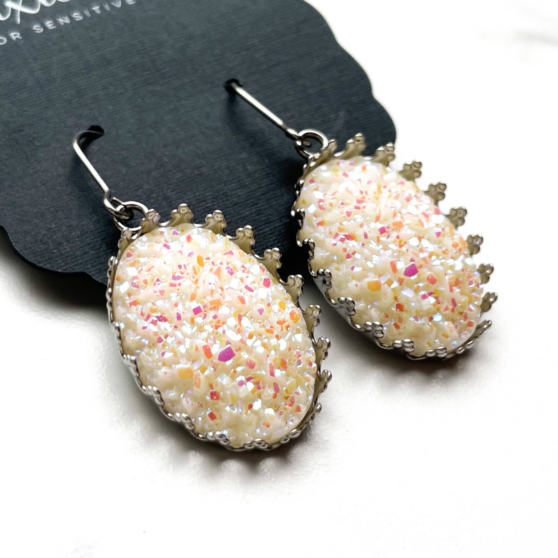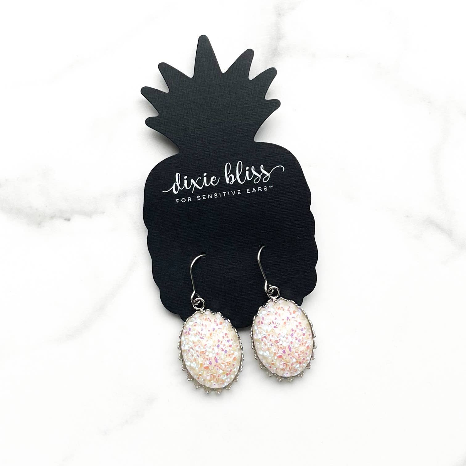 Charming in Snow White is classic and features: *Iridescent White Druzy Oval in a Crown Setting *Measures 1.7" from the top *Hooks are Stainless Steel *Great for sensitive ears *Made in the USA Always wear rubber backs with dangle style earrings
