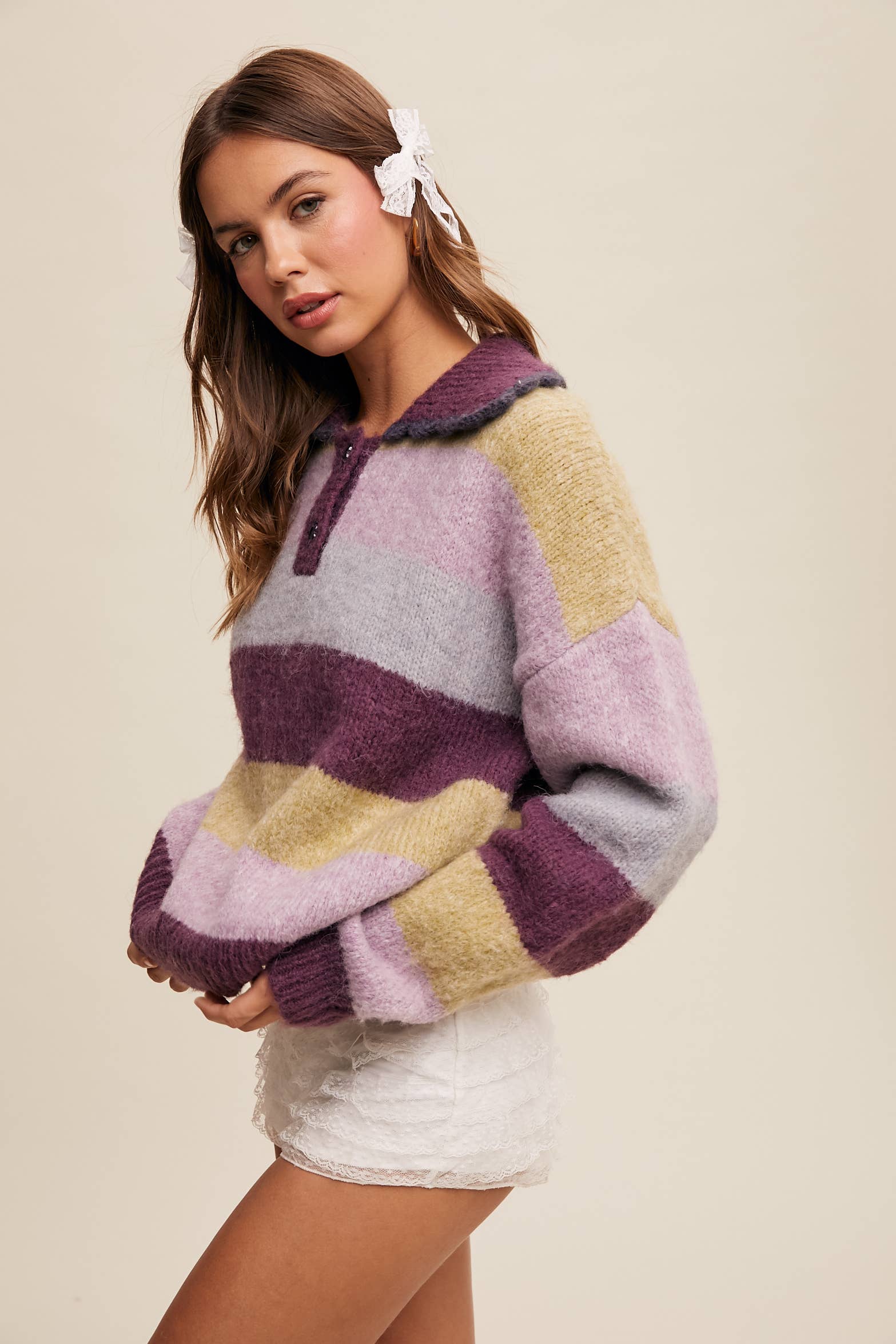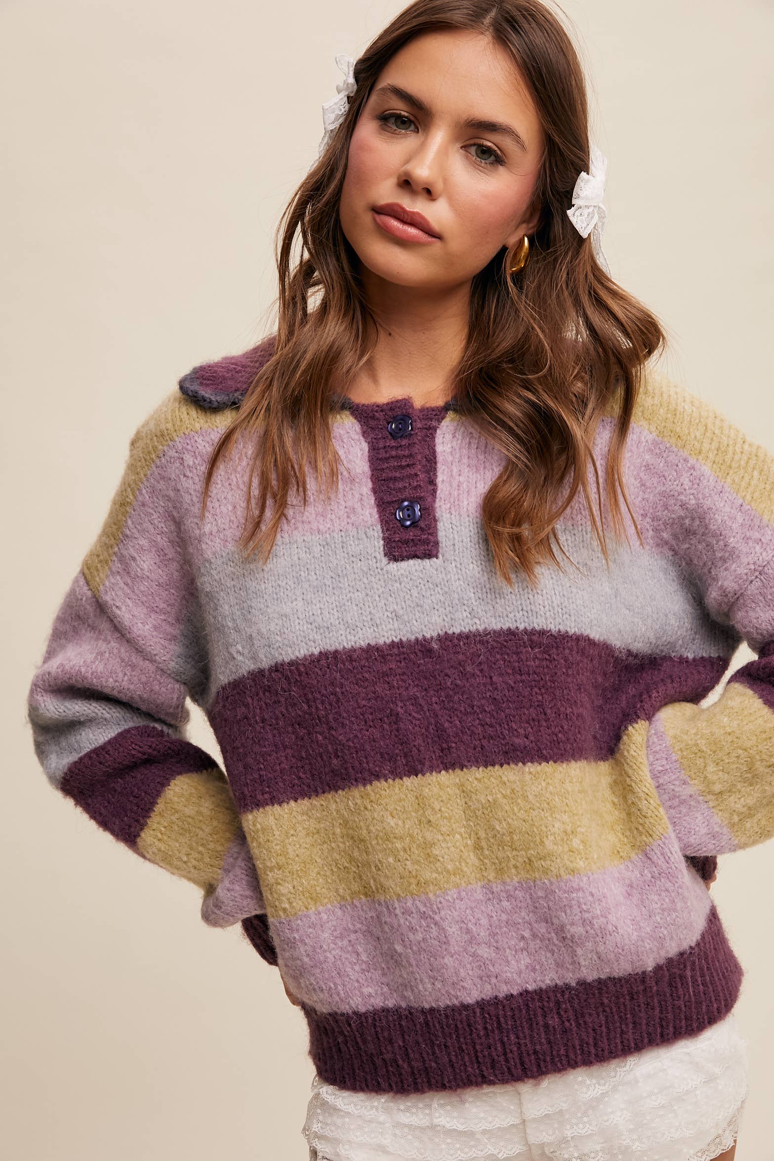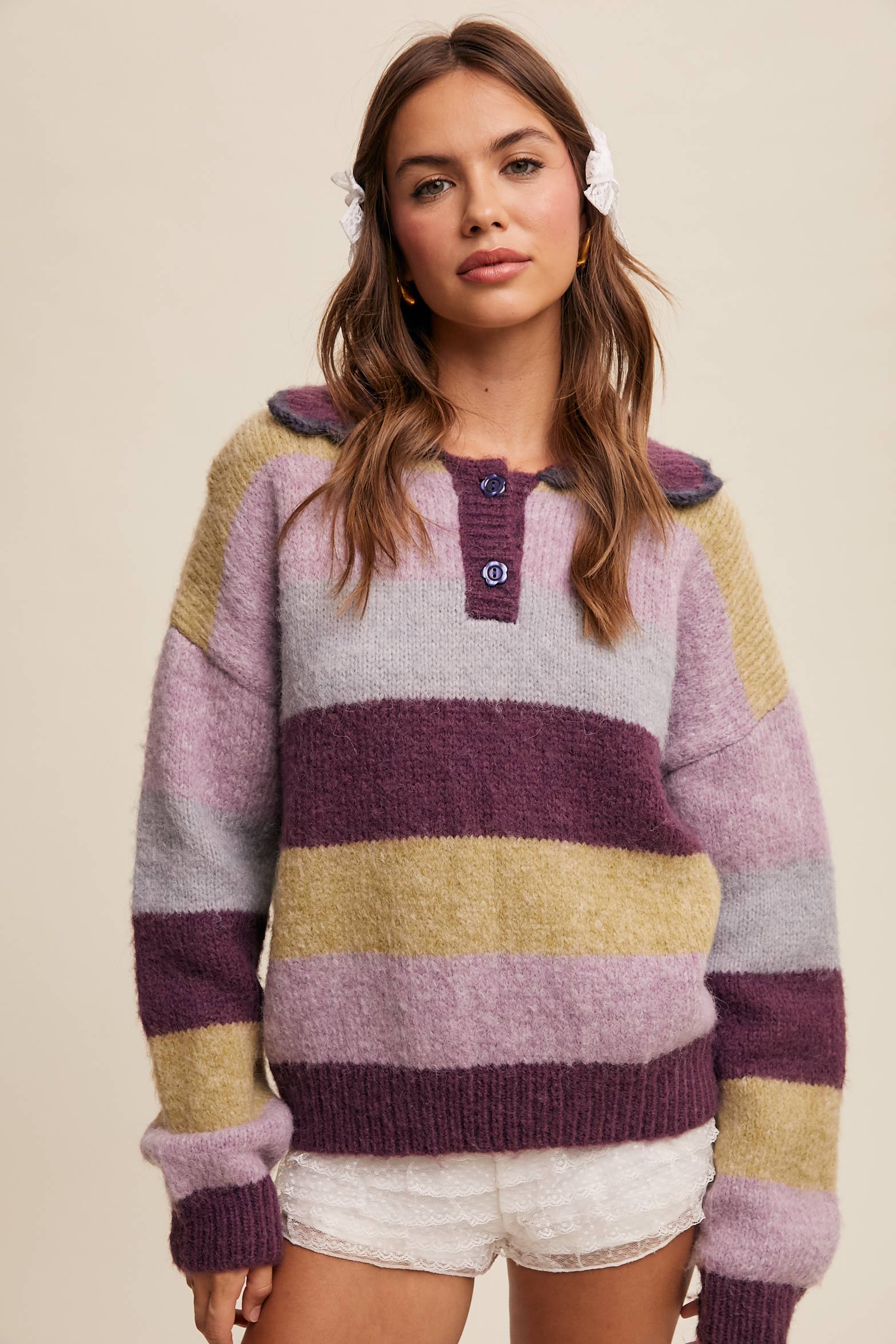 - Soft Brushed Knit: Cozy, textured fabric with a plush feel ideal for cooler days - Multicolor Bold Stripes: Wide horizontal bands in a mix of playful hues for standout charm - Contrast Collar Detail: Scalloped edge collar in a complementary color for a sweet vintage touch - Henley Neckline: Functional three-button placket for adjustable styling - Relaxed Drop Shoulder Fit: Slouchy silhouette with extra room through the sleeve and body - Ribbed Finishes: Thick ribbing at the cuffs and hemline helps maintain shape - Model is 5' 8" 30-24-34.5 and wearing a size Small A whimsical pullover that blends retro stripes with modern comfort-perfect for easy layering and weekend lounging.